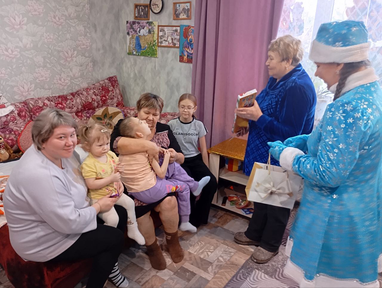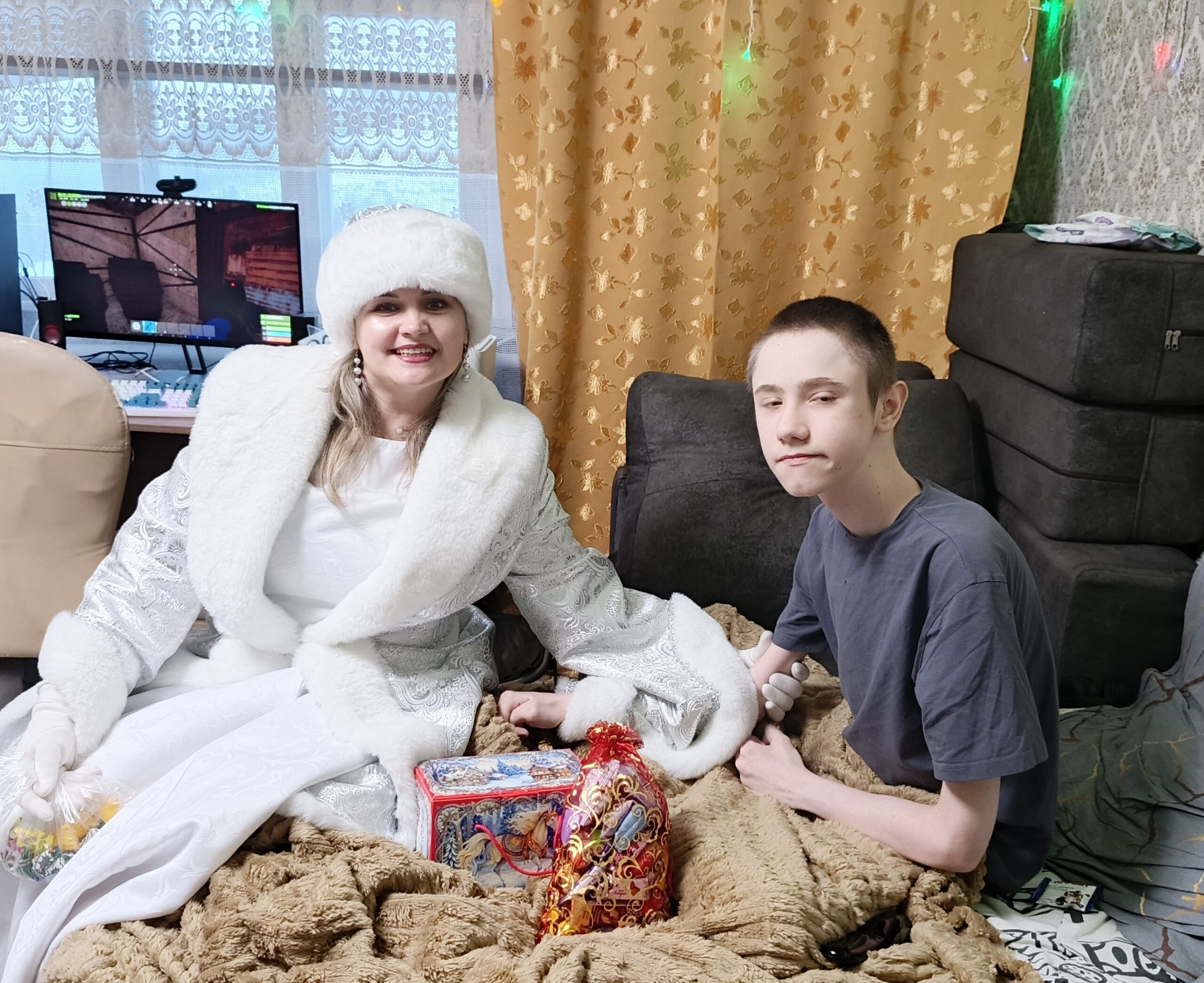 И конечно же нет ничего прекрасней, чем детское восприятие волшебства новогодних дней, для детей-инвалидов которые в силу тяжести заболевания не смогли присутствовать на новогоднем празднике. Для них был организован выезд на дом с Дедом Морозом и Снегурочкой, дарение подарков, море сладостей и сюрпризов. Ведь это так важно создать и поддержать сказочное новогоднее настроение каждому ребенку.